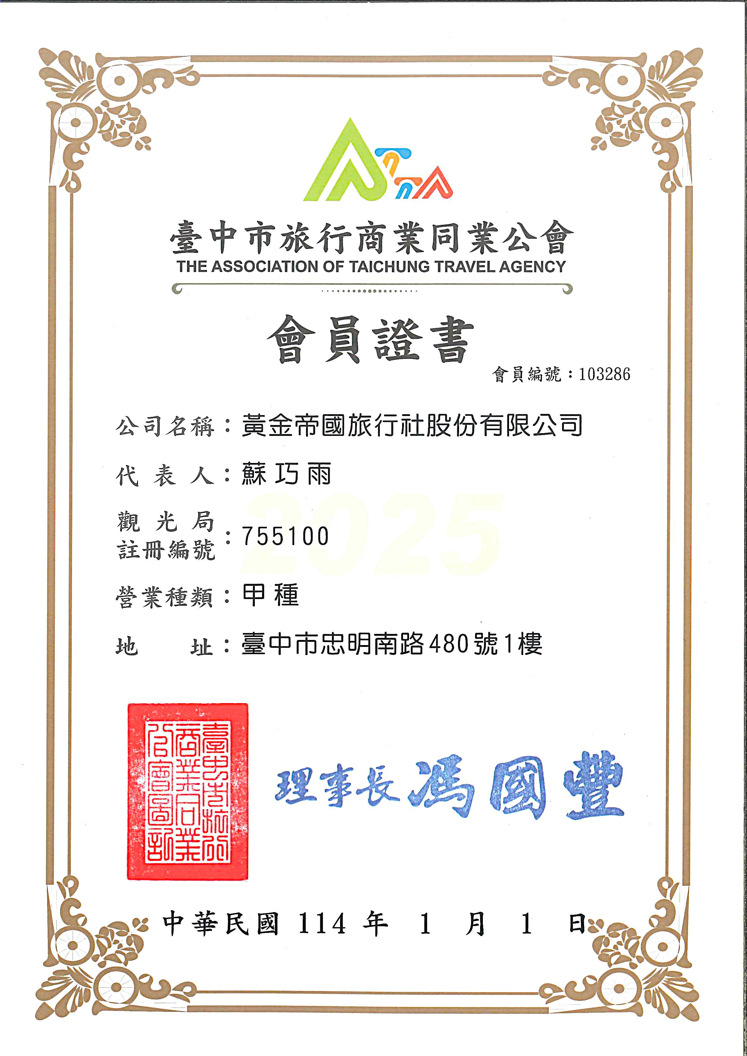 黃金帝國旅行社於2013年成立,以「創鍊‧客製.帶給貴賓們旅遊奢華新境界」自許,提供給旅客最優質、最獨特的旅遊產品,希望皆帶給客人難忘的旅遊回憶,今後黃金帝國旅行社仍將以專業領先自許,提供給更多旅客更優質的旅遊產品。
